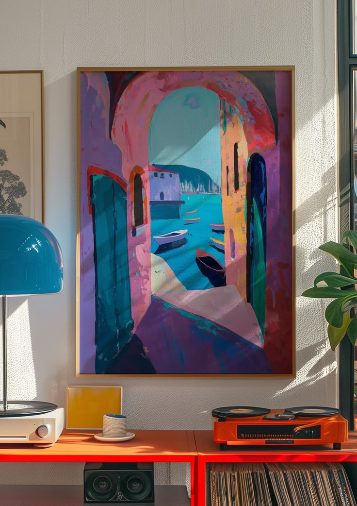 Through a simple window frame, a tranquil scene unfolds: calm waters reflect the clear, open sky, while quaint boats float gently, anchored in quiet harmony. The soft colors and gentle light evoke peace and stillness, inviting the viewer to pause and breathe, as if stepping into a moment suspended between sky and water